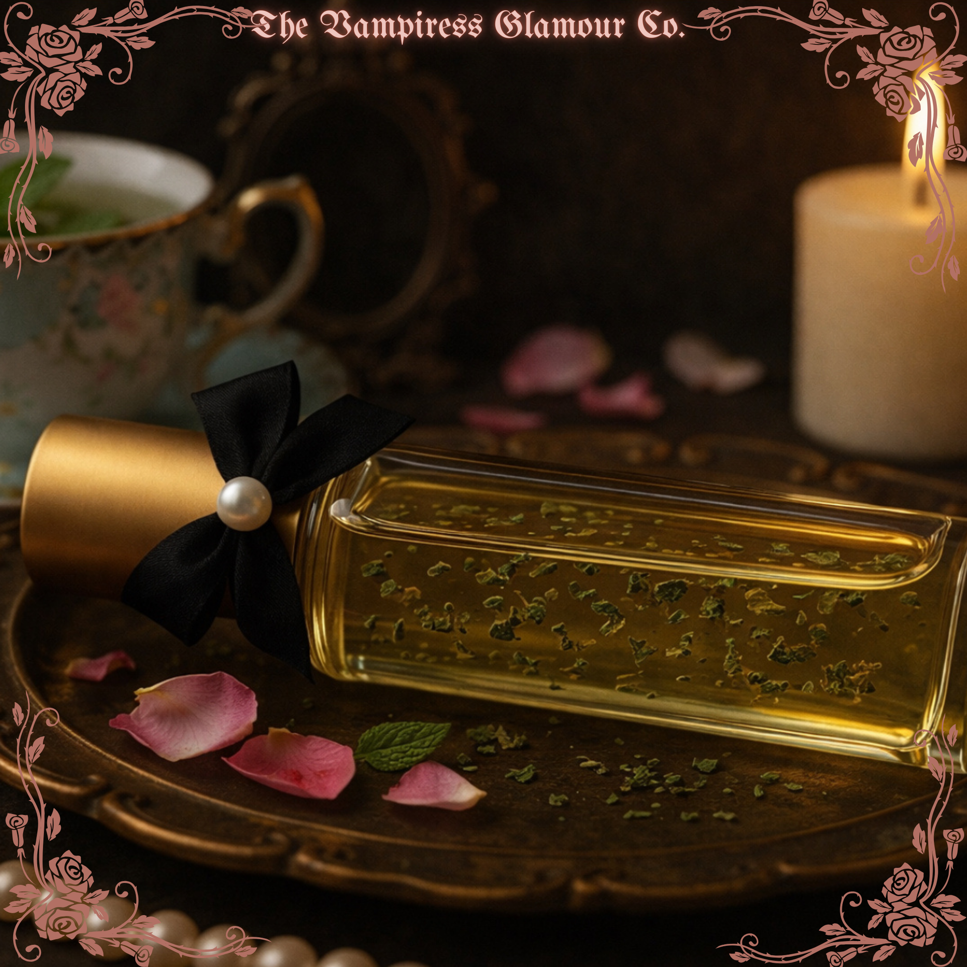 Dried mint is suspended within the oil as a symbol of prosperity, refreshment, and mental clarity, long associated with wealth drawing, business success, and favorable outcomes. The soft essence of mint tea adds a refined freshness that feels composed rather than sharp, evoking calm authority, preparedness, and quiet confidence.