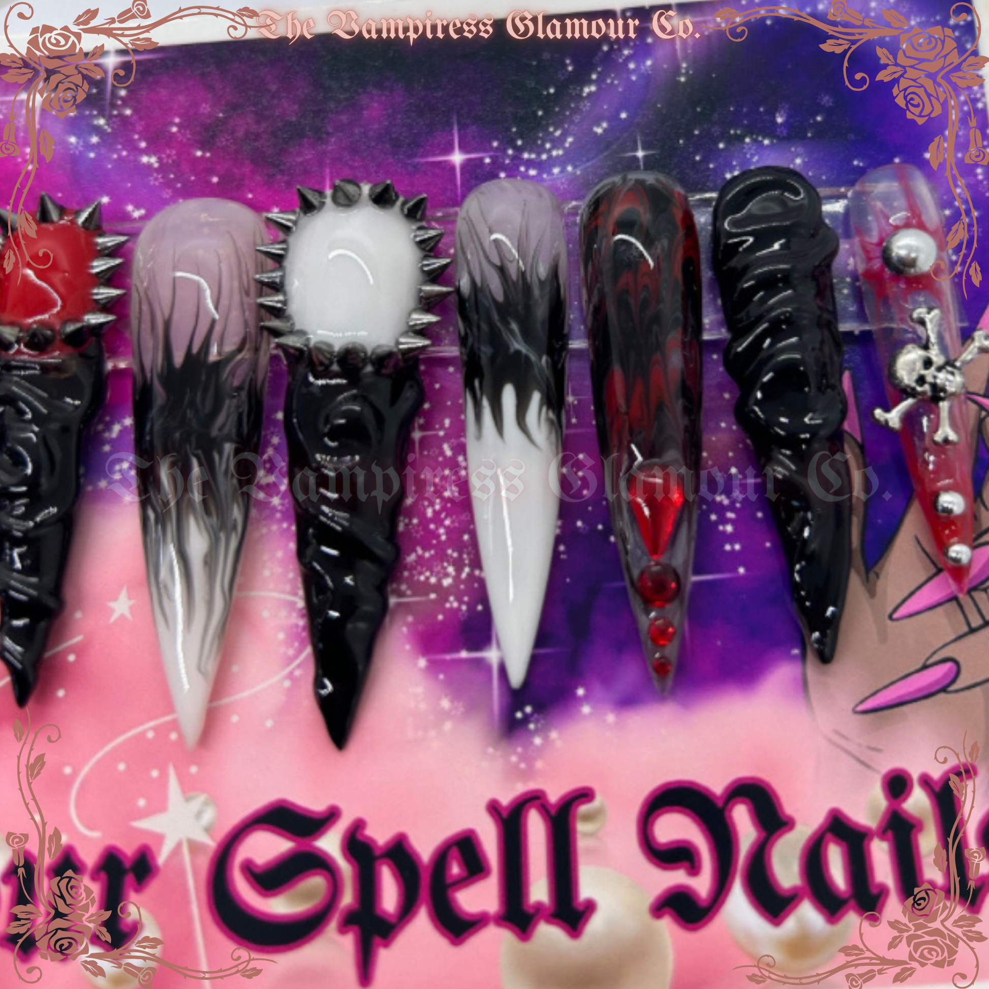 This sculptural set merges black, white, and crimson into a dripping visual incantation. Every claw gleams like molten obsidian, streaked with smoke, ash, and blood-red accents. It’s the embodiment of vampiric glamour — seductive, bold, and completely liberated.