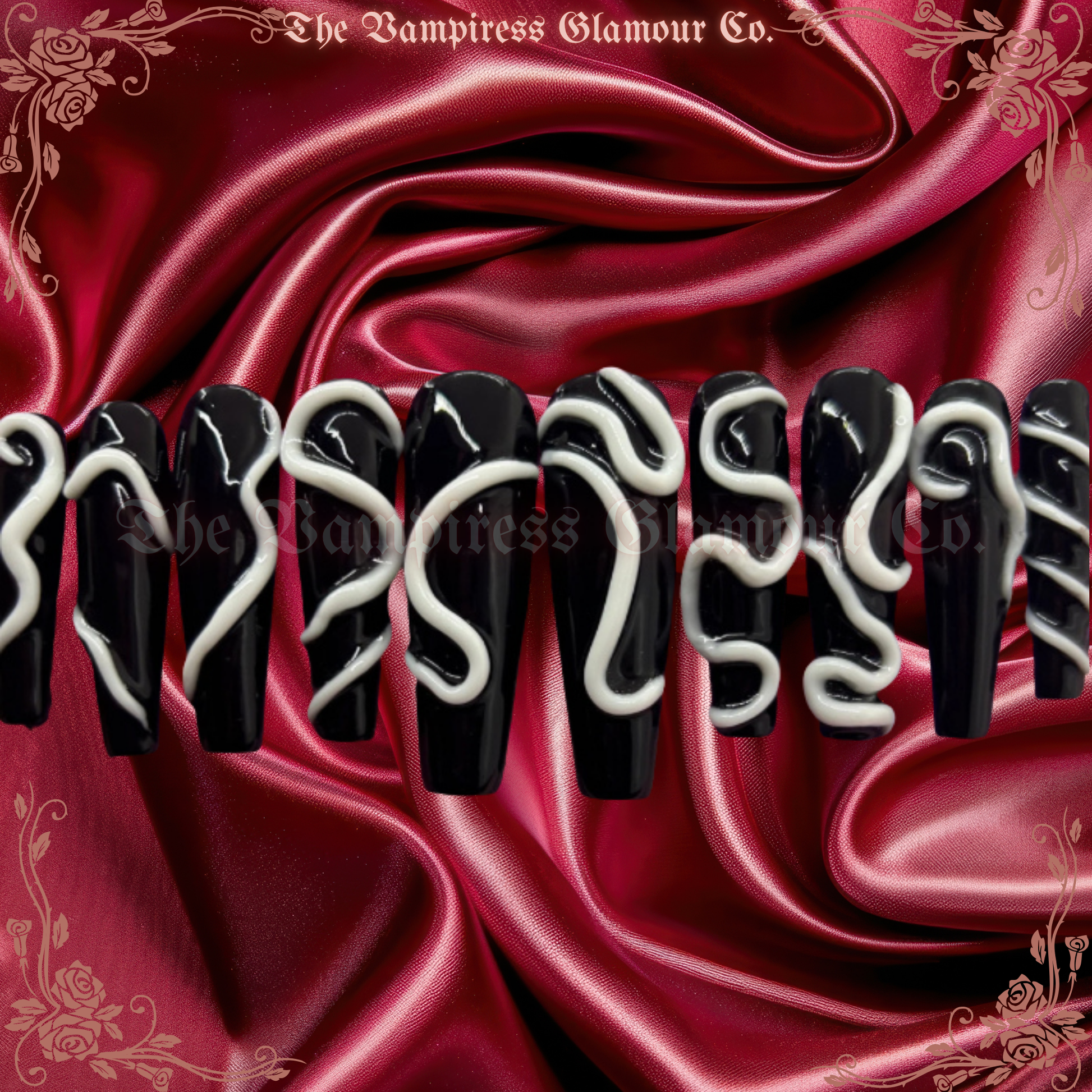 Each nail is a talisman, carved with the serpentine flow of hidden knowledge. The raised white designs coil like oracular script, channeling messages from shadow and moonlight. This set was crafted for the seer, the high priestess, the witch who reads omens not in cards but in the reflection of her own immaculate claws.