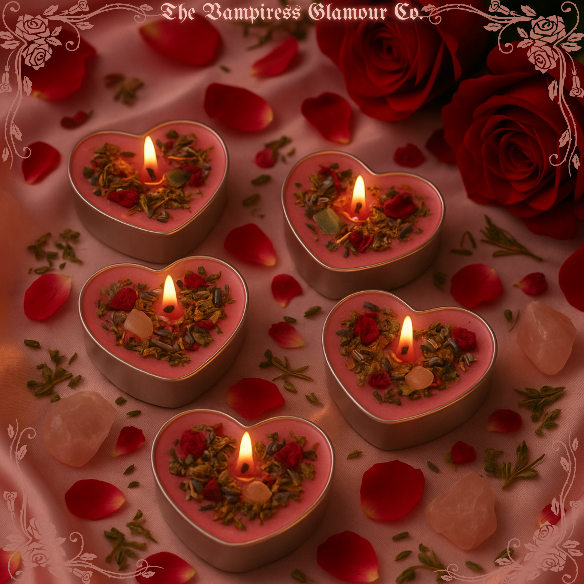 Each tea light is ritually poured and dressed with The Vampiress Glamour Co. proprietary blend of love-drawing oils, botanicals, and Venusian color magick. Crystals and herbs are placed by hand, symbolizing devotion, beauty, and emotional harmony.
