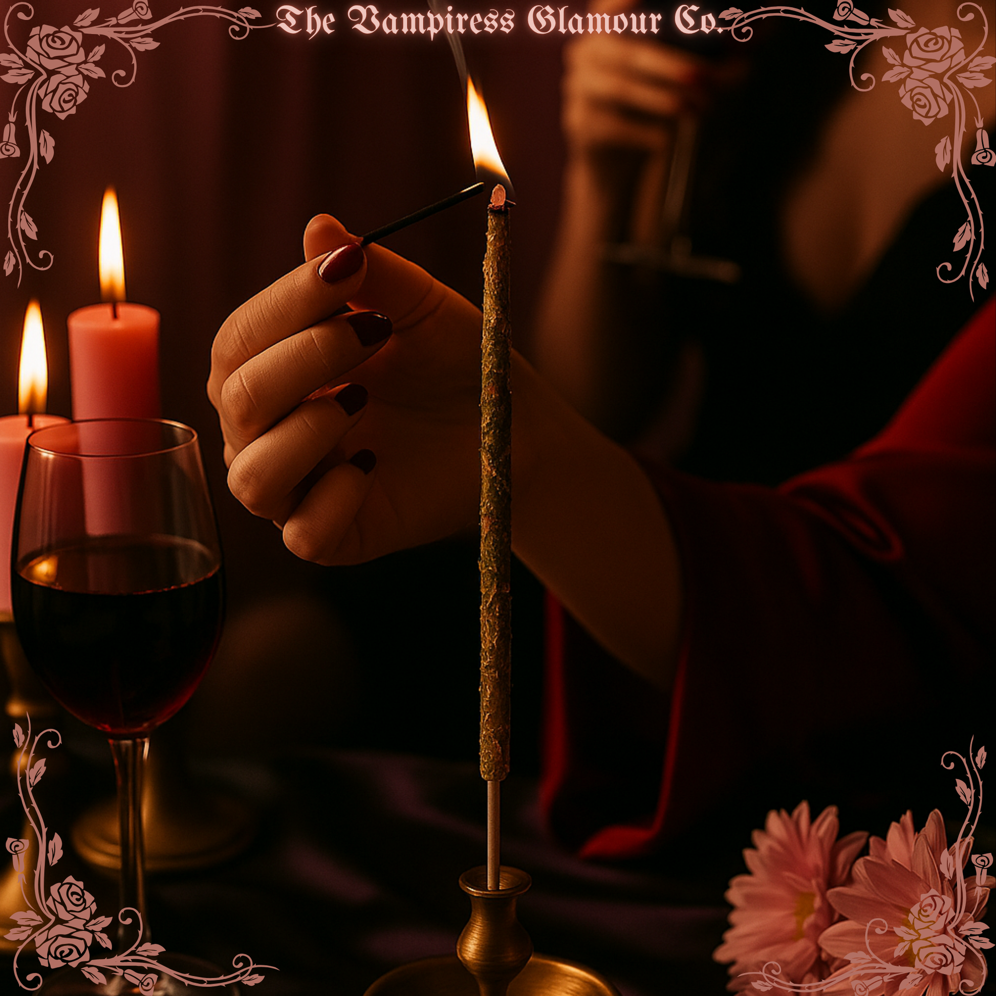 Each stick is ritually hand-crafted with The Vampiress Glamour Co.’s proprietary blend of sacred herbs, florals, and resins, infused with spells of attraction and lunar enchantment. This is not atmosphere incense; it is a living spell meant to be tended with breath and focus. Feed the flame, recite your intention, and let the smoke carry your desire into the unseen.