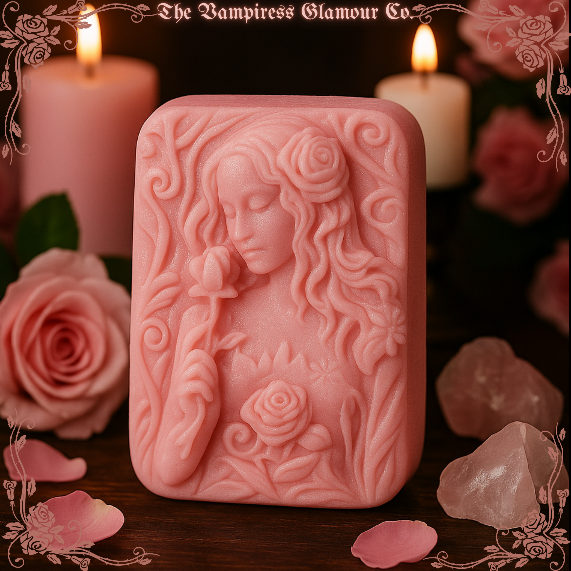 Infused with Damiana and Catnip—herbs of allure and sweet persuasion—alongside Peach Blossom and Rose within The Vampiress Glamour Co. Proprietary Herbal Blend, this soap transforms the mundane act of bathing into an act of summoning abundance and adoration.