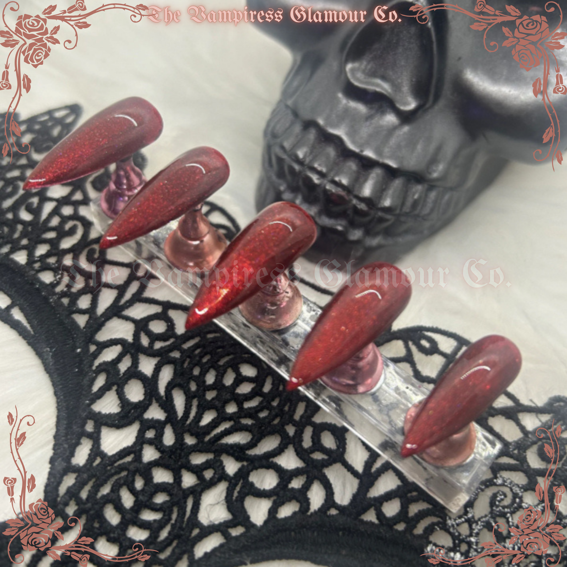 Each nail is ritually hand-painted and sealed within The Vampiress Glamour Co. Atelier, where beauty and danger entwine. Hidden beneath each coat lies a sigil of allure, dominance, and desire, drawn to magnify your magnetic field and bend attention toward you like gravity.