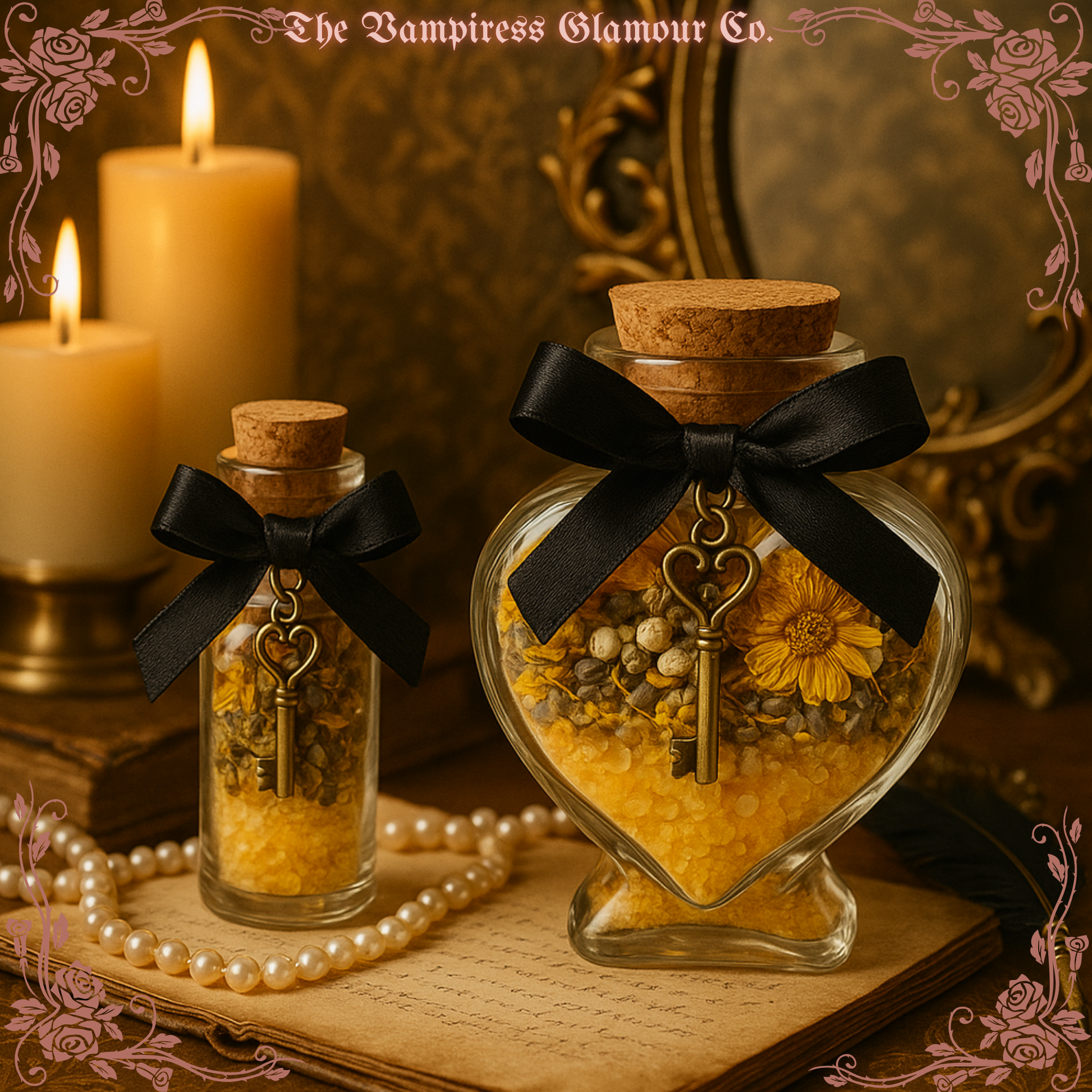 A spell in glass, a charm of golden awakening. This heart-shaped bottle holds the breath of inspiration itself — a sacred vow to your inner muse. Each jar is layered in bands of beauty: golden salt shimmering like sunlight over water, calendula and lemongrass stirring warmth and joy, chamomile and lavender softening the mind for divine reception, and citrine with tiger’s eye gleaming like bottled firelight.