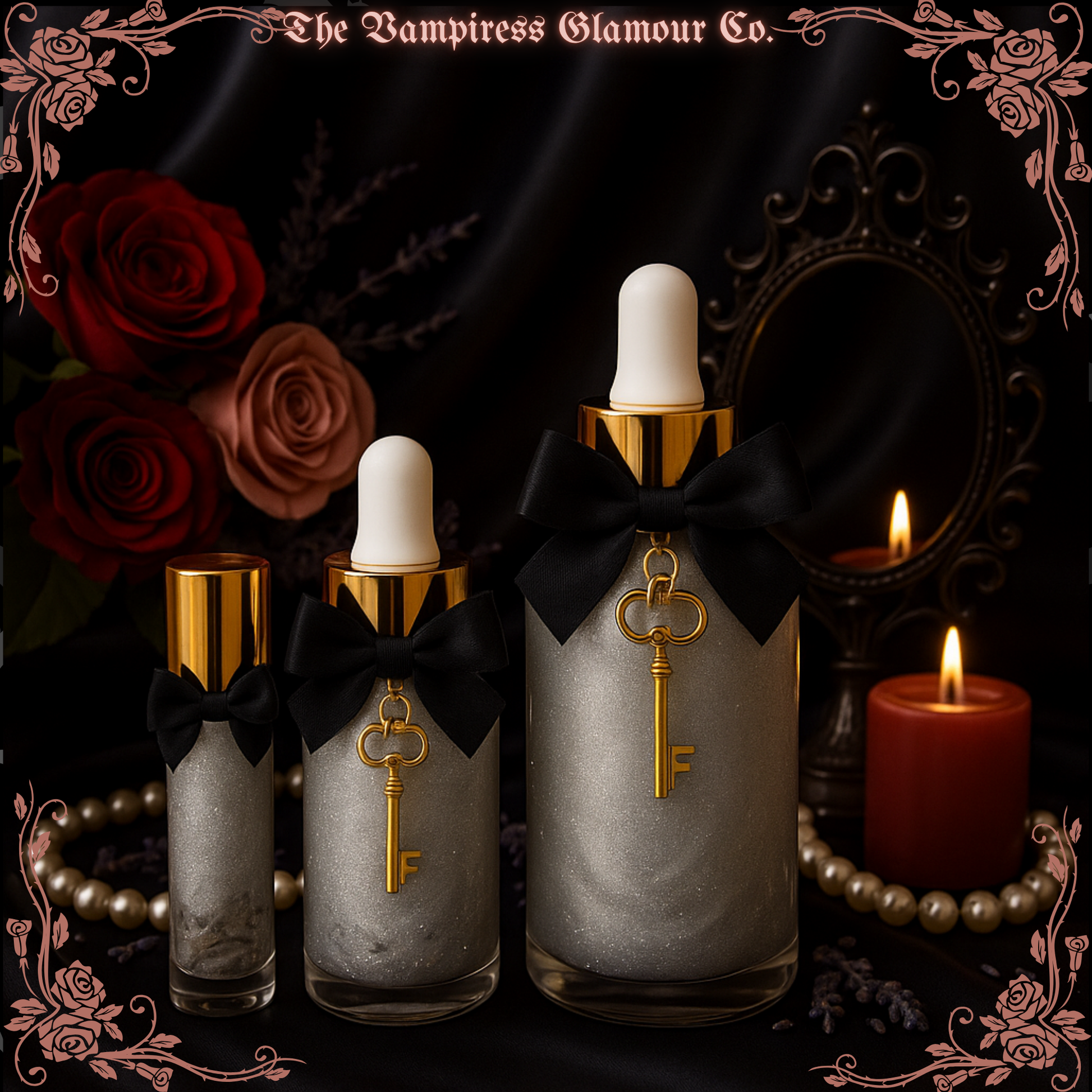 • 2 oz & 3.4 oz Droppers: Fractionated Coconut Oil, Apricot Kernel Oil, Sunflower Oil, Jojoba Oil, Vitamin E Oil, Essential Oils, Fragrance Oils, Lavender Petals, The Vampiress Glamour Co. Herbal Blend, Mica Shimmer, Tiger’s Eye.
