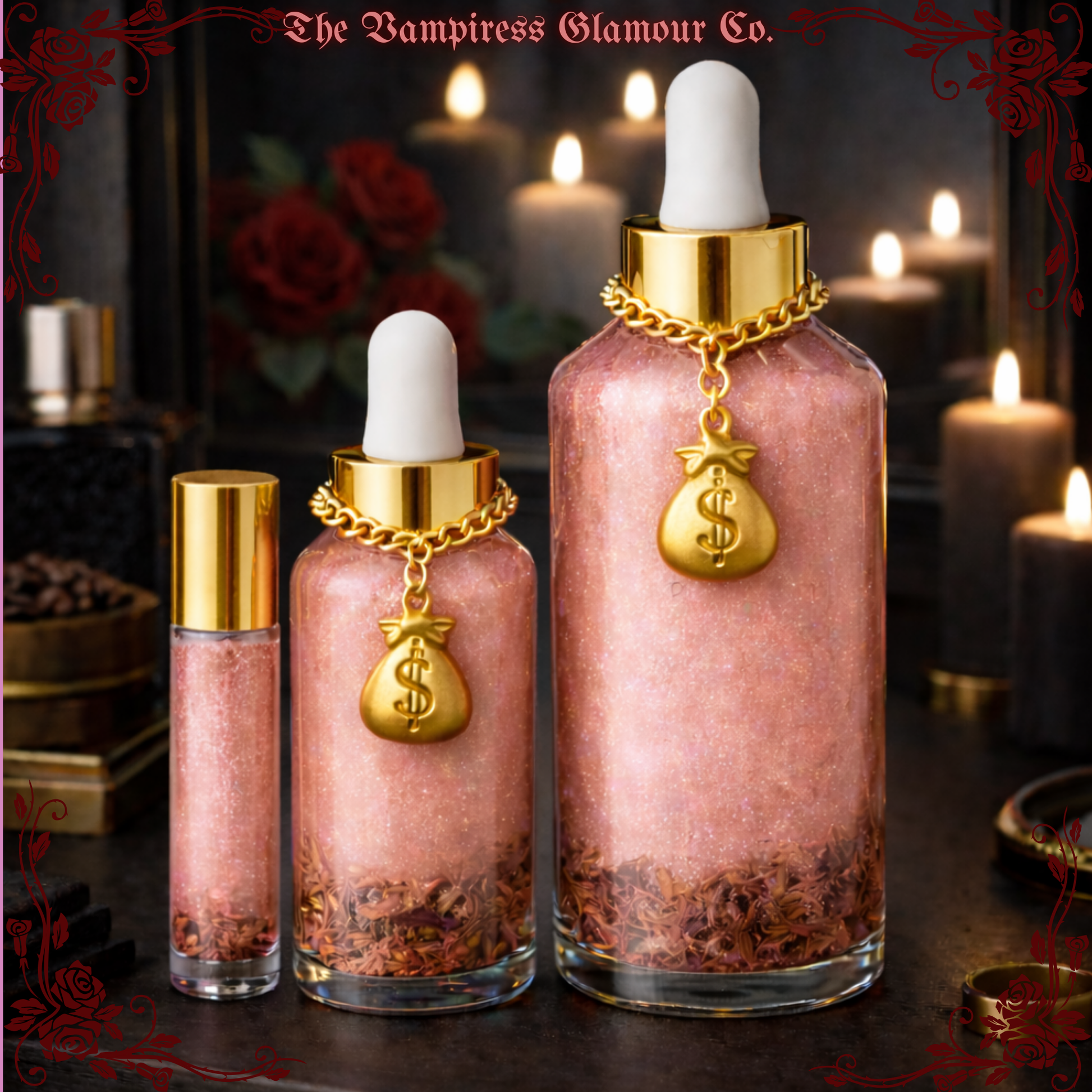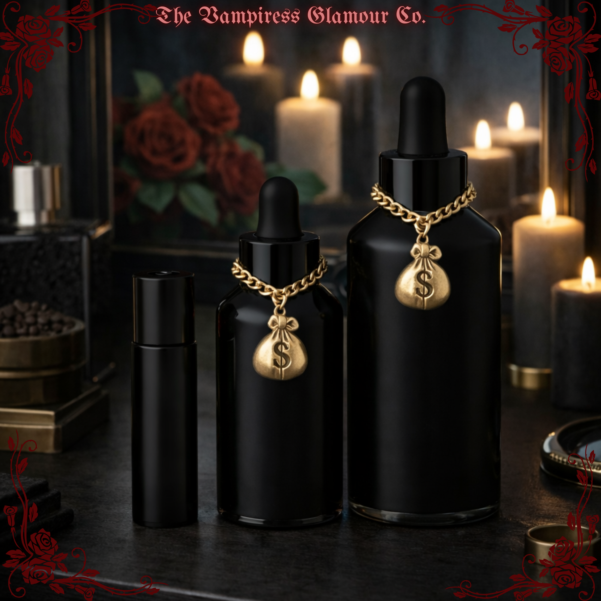 Each bottle is dressed with rose quartz for magnetism and heart-opening charm. It contains dried rose, jasmine, and osmanthus, along with The Vampiress Glamour Co. proprietary herbal spell blend: a mix of botanicals chosen for seduction, luxury, and the art of receiving.